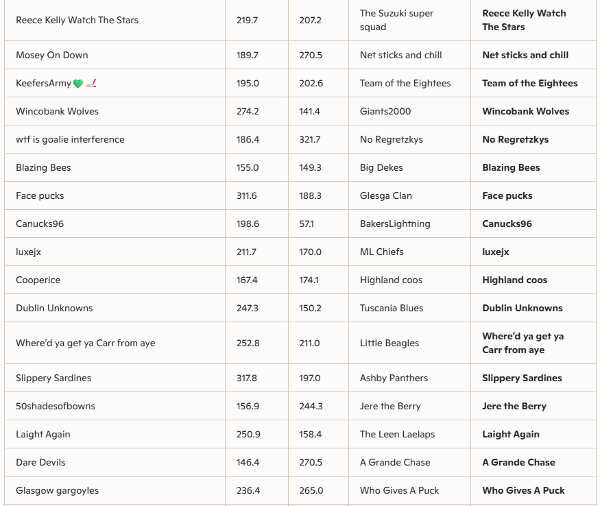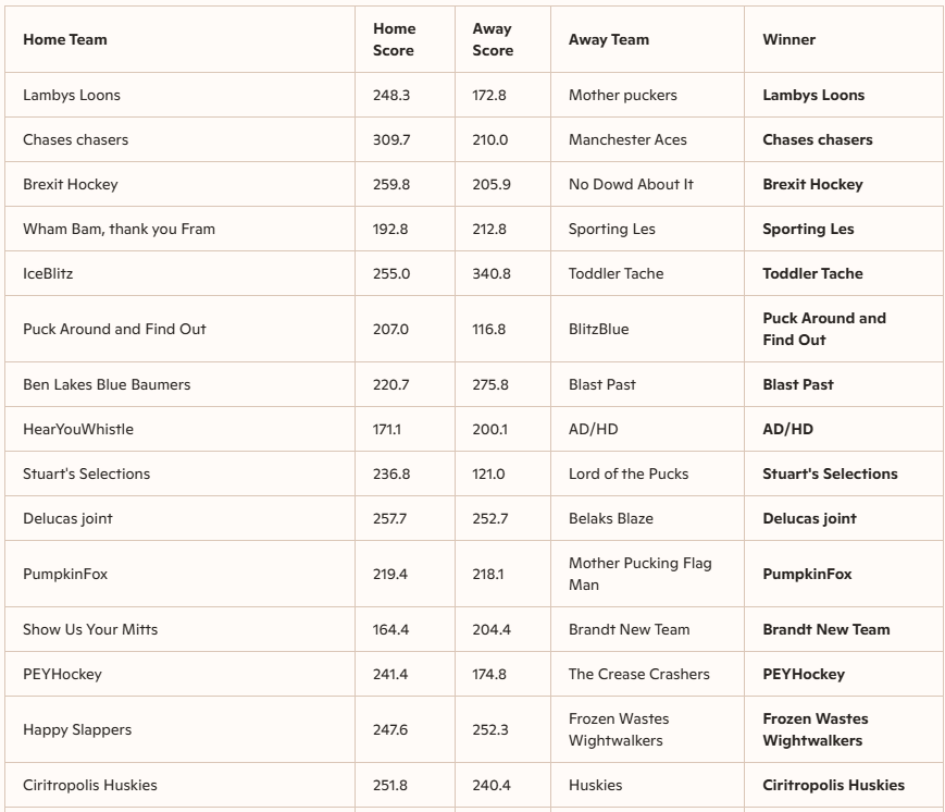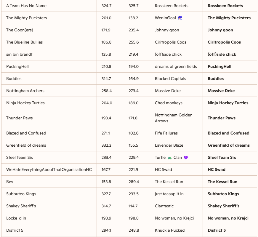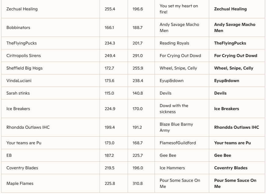 The second round of the FHL UK Cup has finished with a wide range of scoring performances, with several high-scoring games and some notably close contests. The highest team score recorded was 332.2 points by Greenfield of dreams, demonstrating a dominant offensive display. Other teams such as Subbuteo Kings (327.7) and Slippery Sardines (317.8) also posted impressive high scores, highlighting the competitive nature of the cup. On the lower end, some teams struggled to reach the 150-point mark, with the lowest scores including Blazing Bees at 155.0 and Sarah stinks at 115.0, indicating some defensive challenges or tough matchups.
